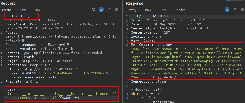 Comparing these two uid values we can see that the username is reflected before the blob of data. But when we entered the SSTI payload {{3*3}}9 was reflected instead. This indicates that our payload successfully evaluated. We can run with this to try and read the flag based on the uid value.