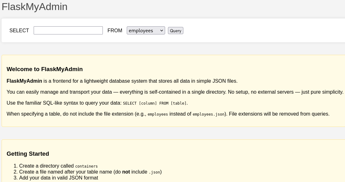 This app reads data from .json files in a specific directory - while stripping file extensions. It gives us a handful of files such as employees to read from, and we’re able to use “SQL-like syntax”.